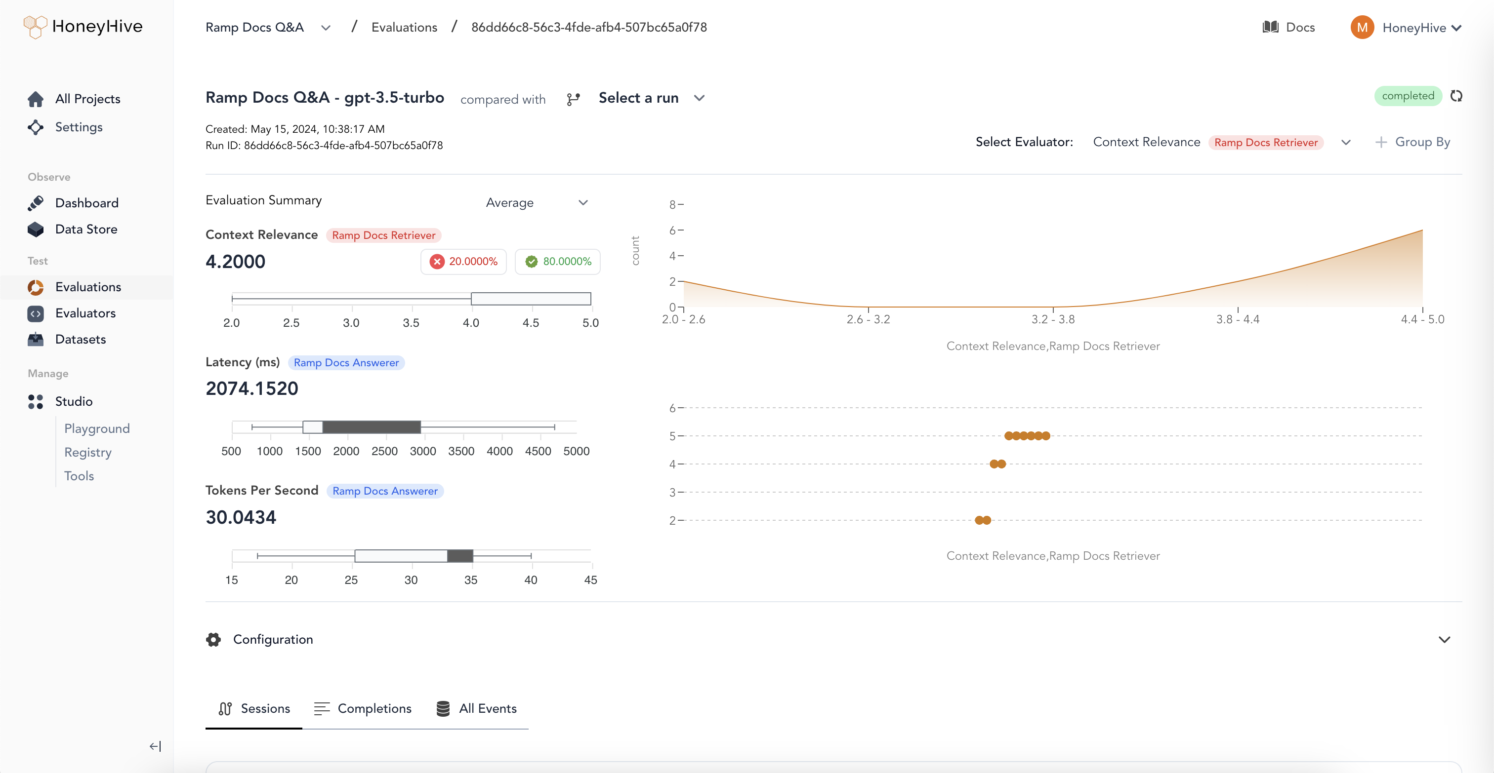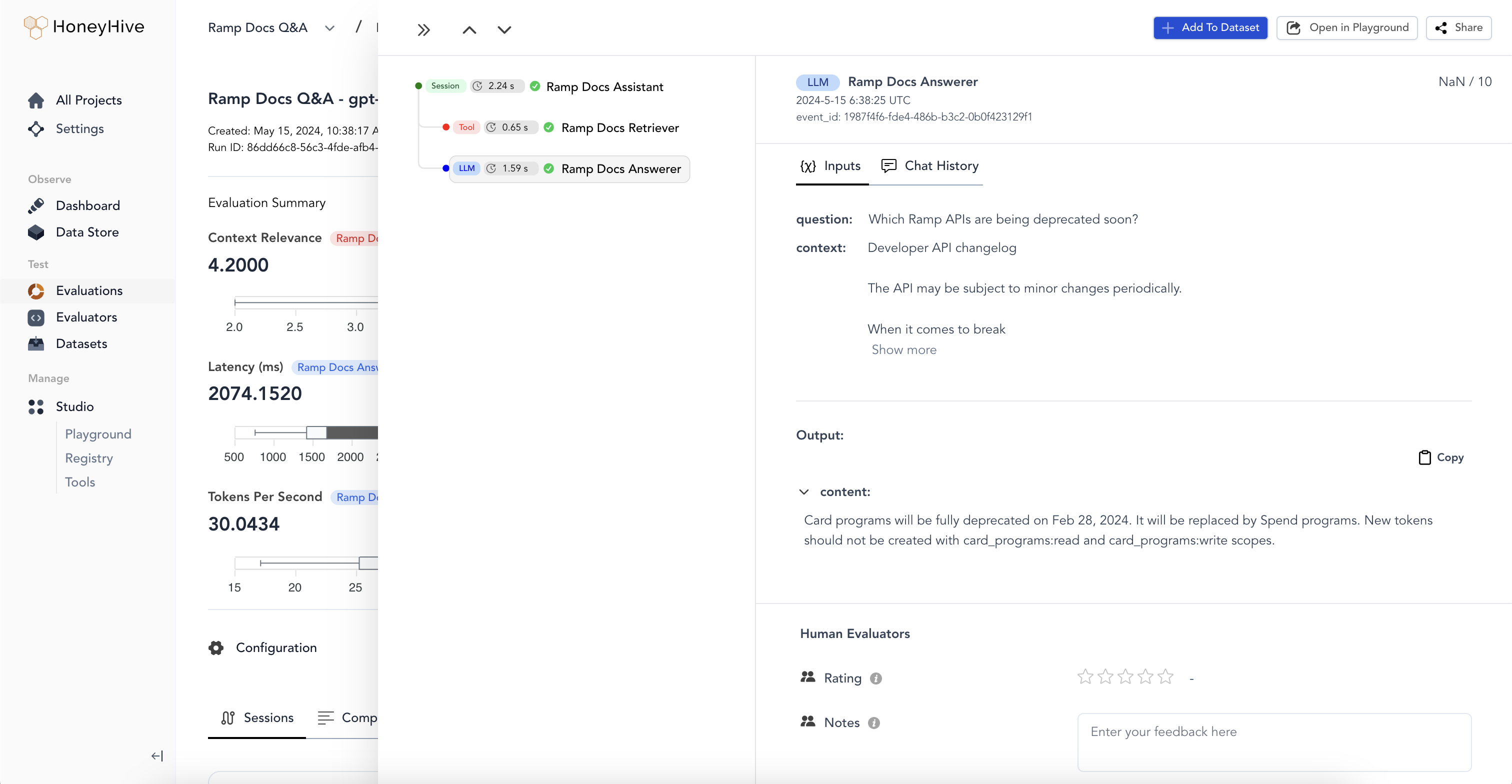 Everything in HoneyHive is organized by projects. A project is a workspace to develop, test, and monitor a specific AI application.Sessions & Events