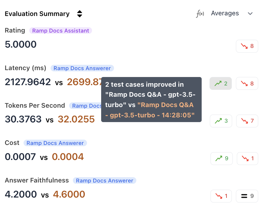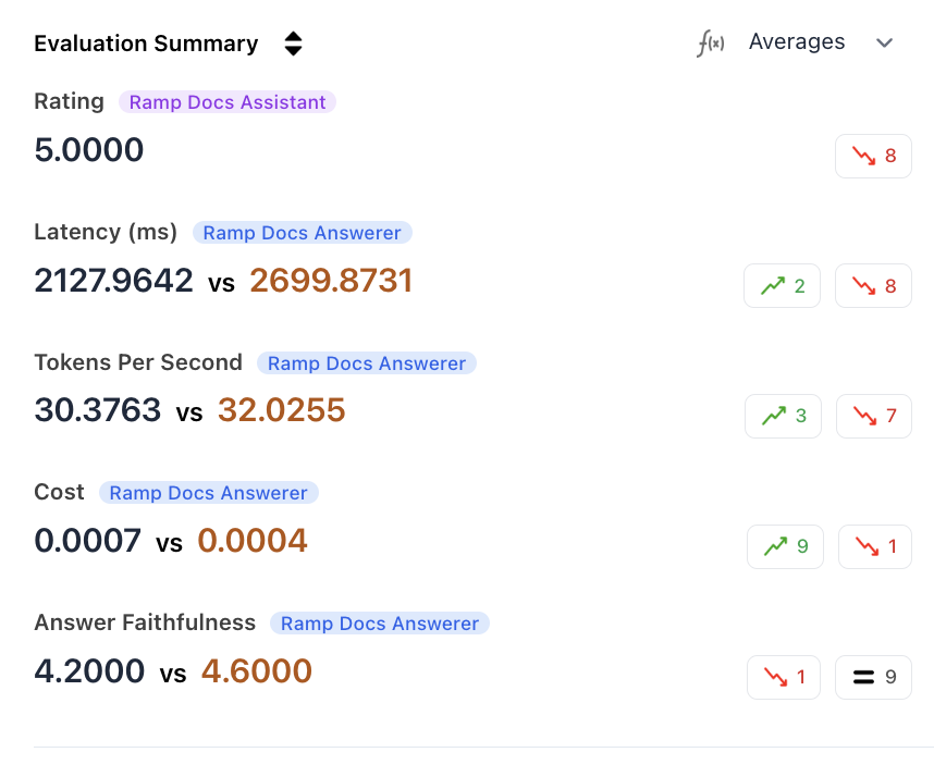 HoneyHive allows you to compare experiments at each individual step level, giving you granular insights into how different configurations perform at specific stages of your workflow.2. Aggregated Metrics