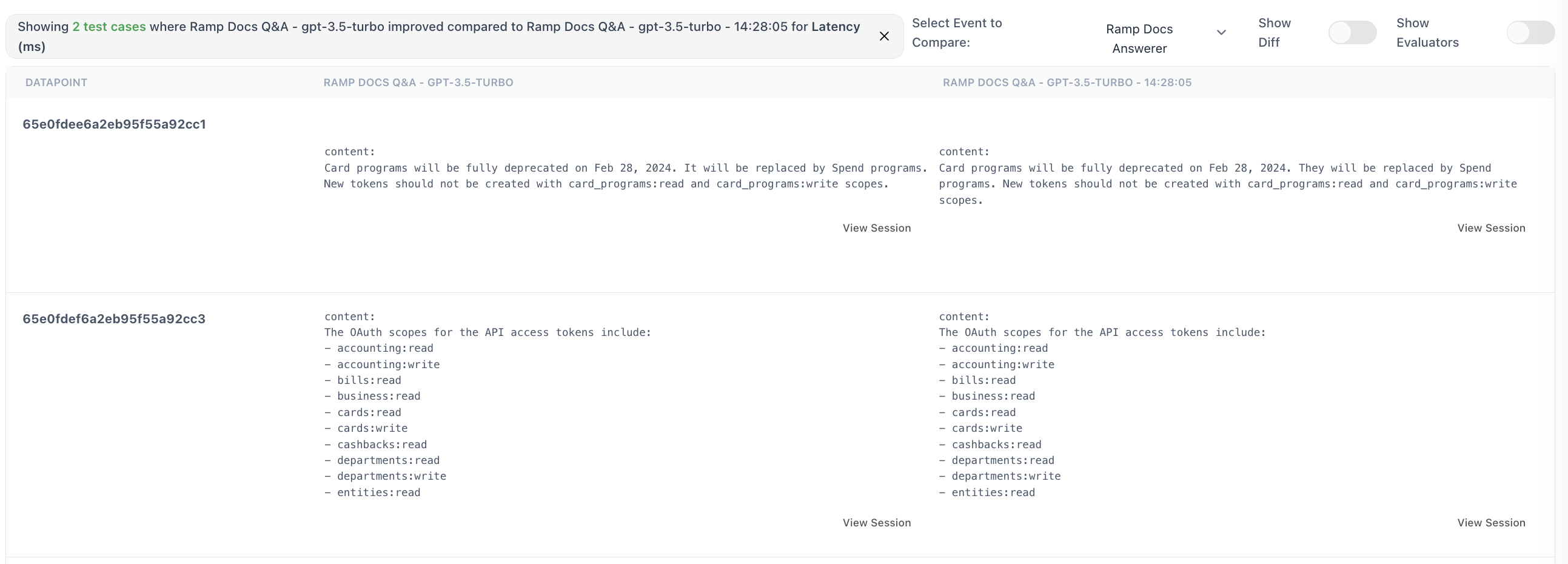 Let’s walk through the key features of the comparison view to help you effectively compare your experiments.Advanced Comparison Features