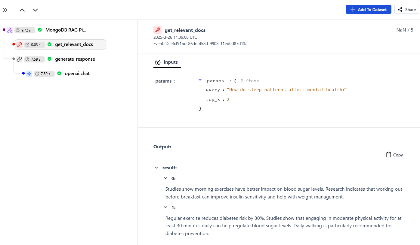 The pipeline consists of the following steps:- Document Retrieval: Using MongoDB’s vector search capabilities, we retrieve the most relevant documents for a given query.