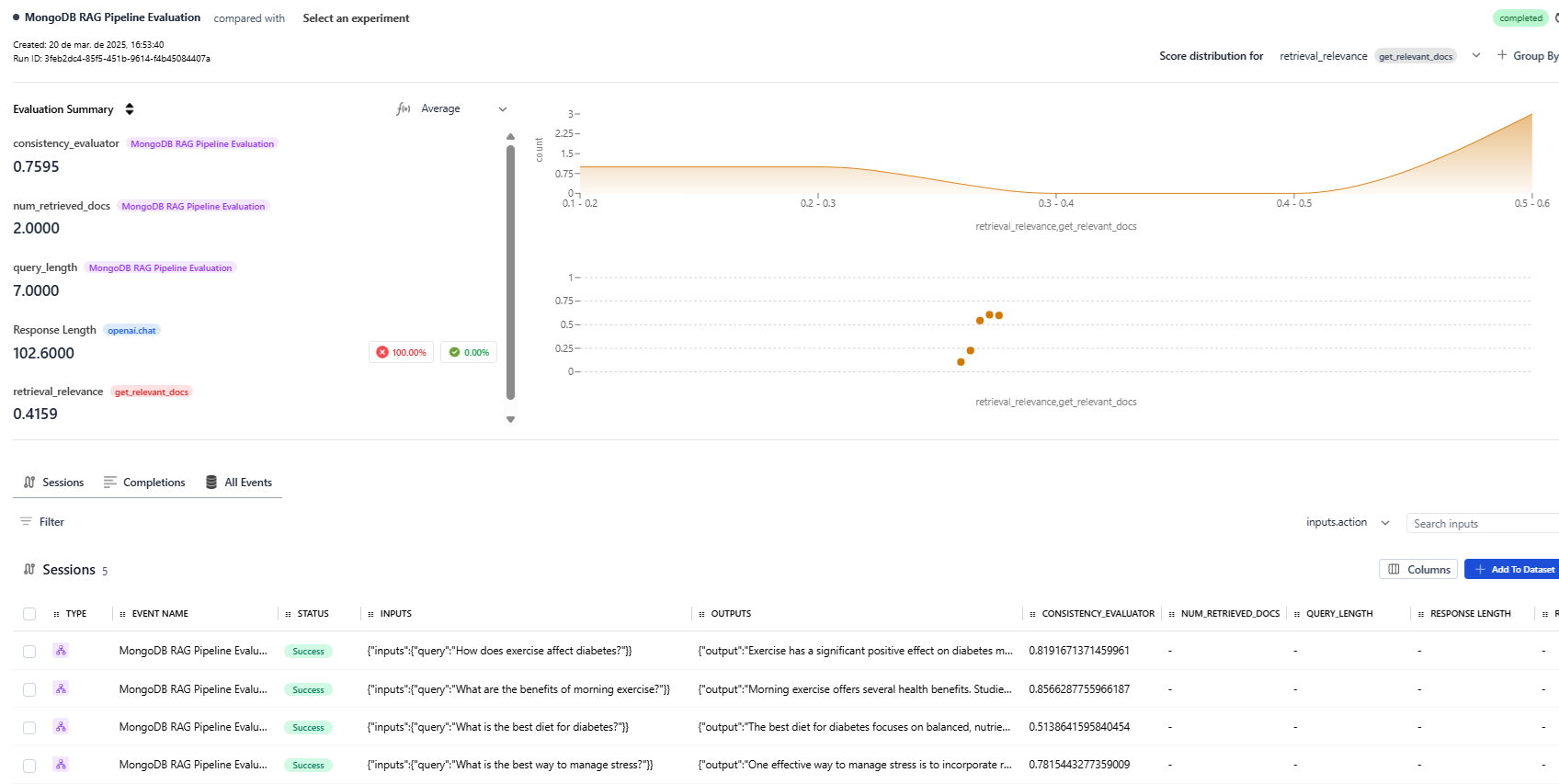 For the retrieval relevance evaluator, we calculate the cosine similarity between the query and each retrieved document. The final metric is the average of these similarity scores. For the response consistency evaluator, we assess the semantic similarity between the generated output and the ground truth. This helps determine how closely the model’s response aligns with the expected answer.Running the Experiment