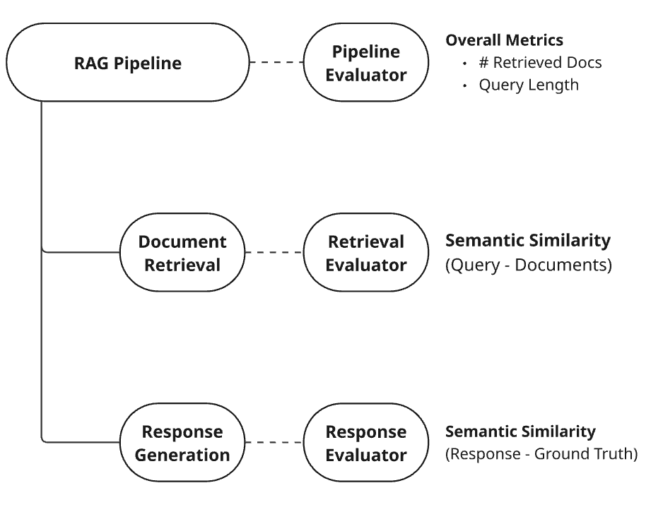 - Pipeline Evaluator: This evaluator generates basic metrics related to the overall pipeline, such as the number of retrieved documents and the query length.