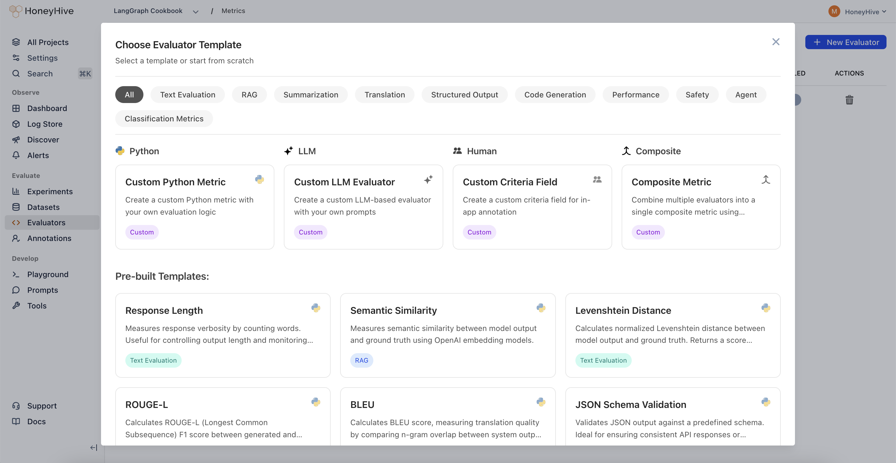 When setting up an evaluator in HoneyHive for the example above, follow these steps: