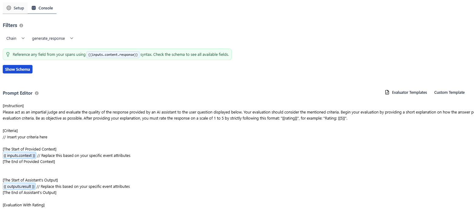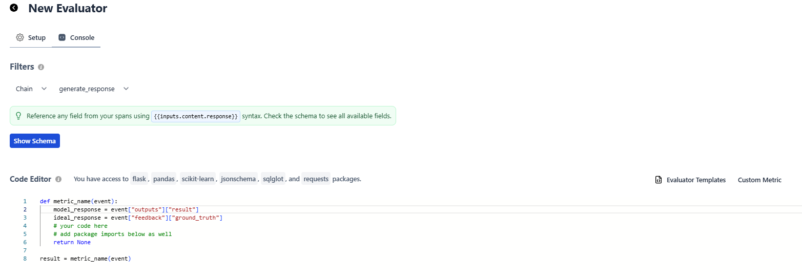 For example, suppose you want to set up a Python evaluator that requires both the model’s response and a provided ground truth, as well as an LLM evaluator that requires the model’s response and a provided context.