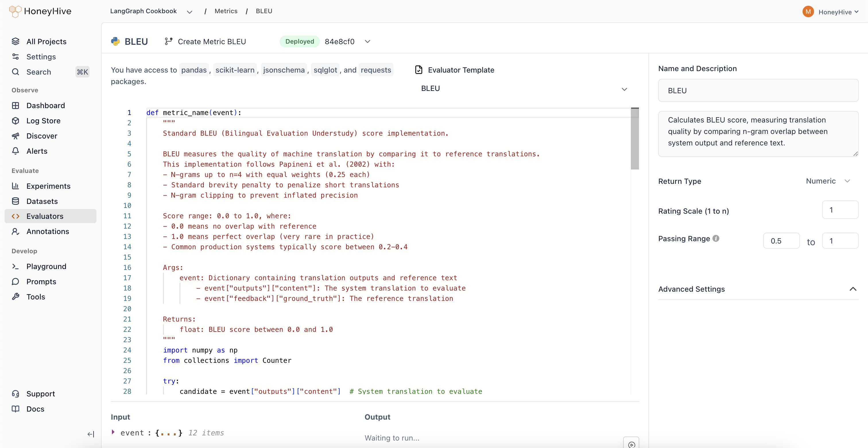 HoneyHive’s server-side Python evaluators have access to Python’s complete standard library and popular third-party packages including