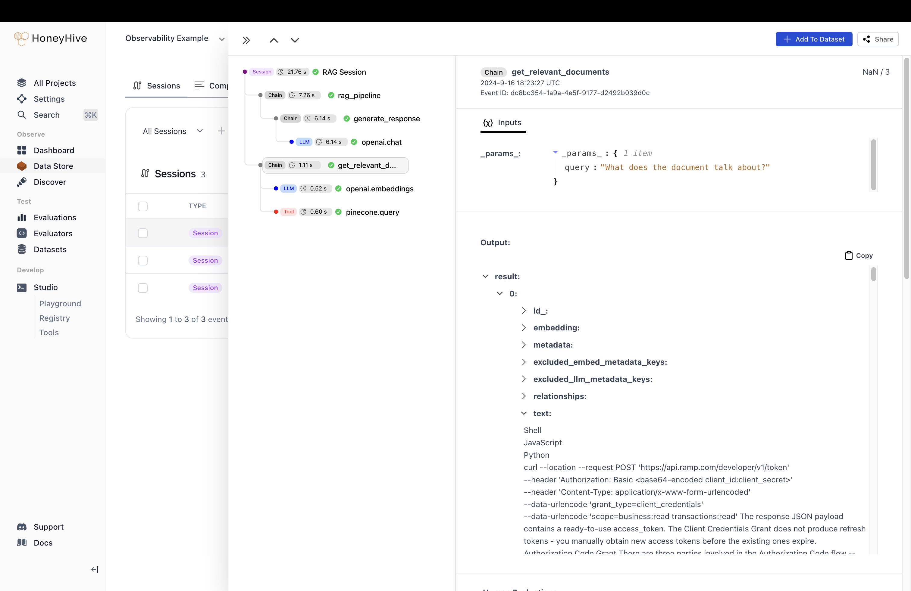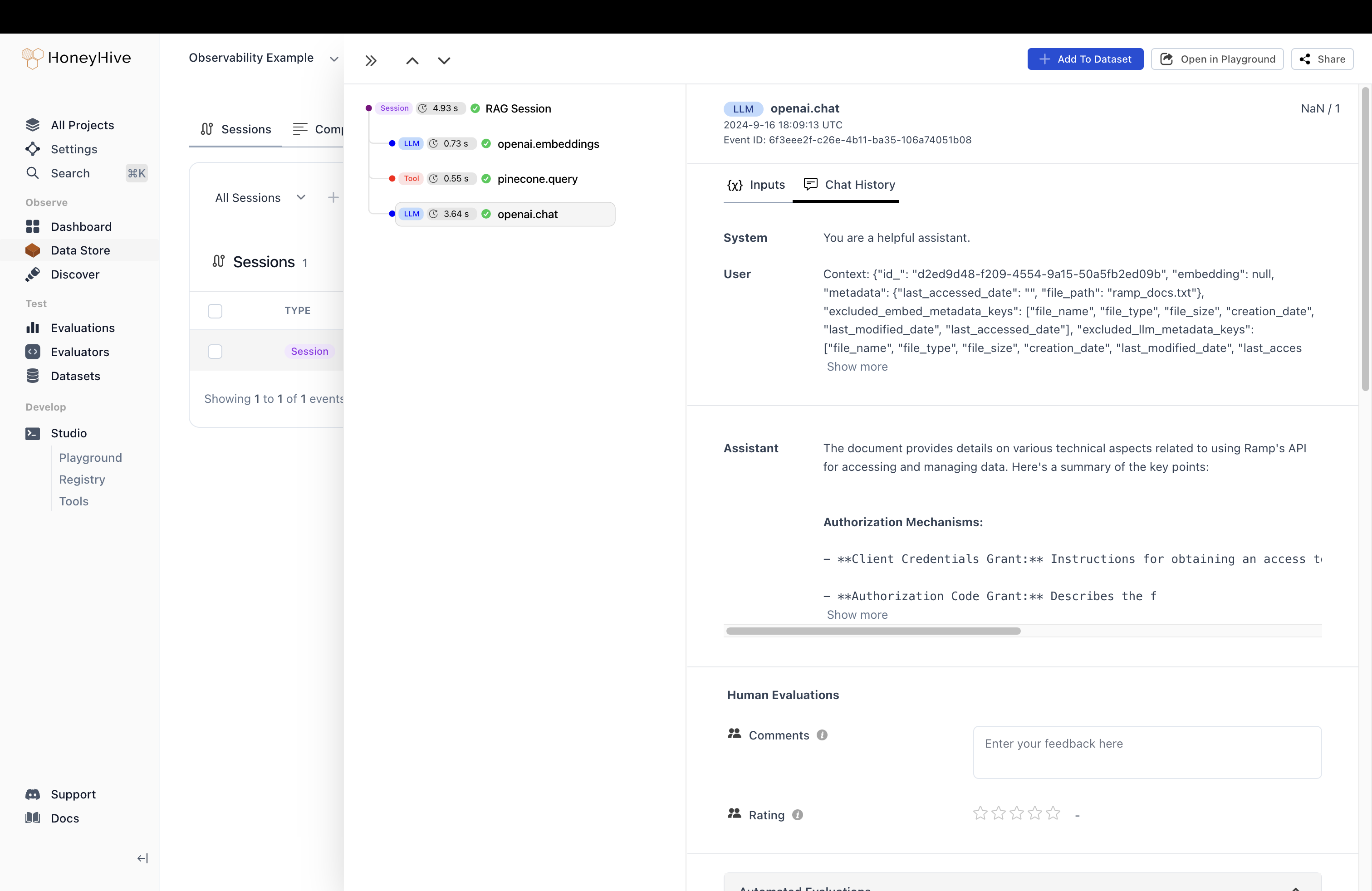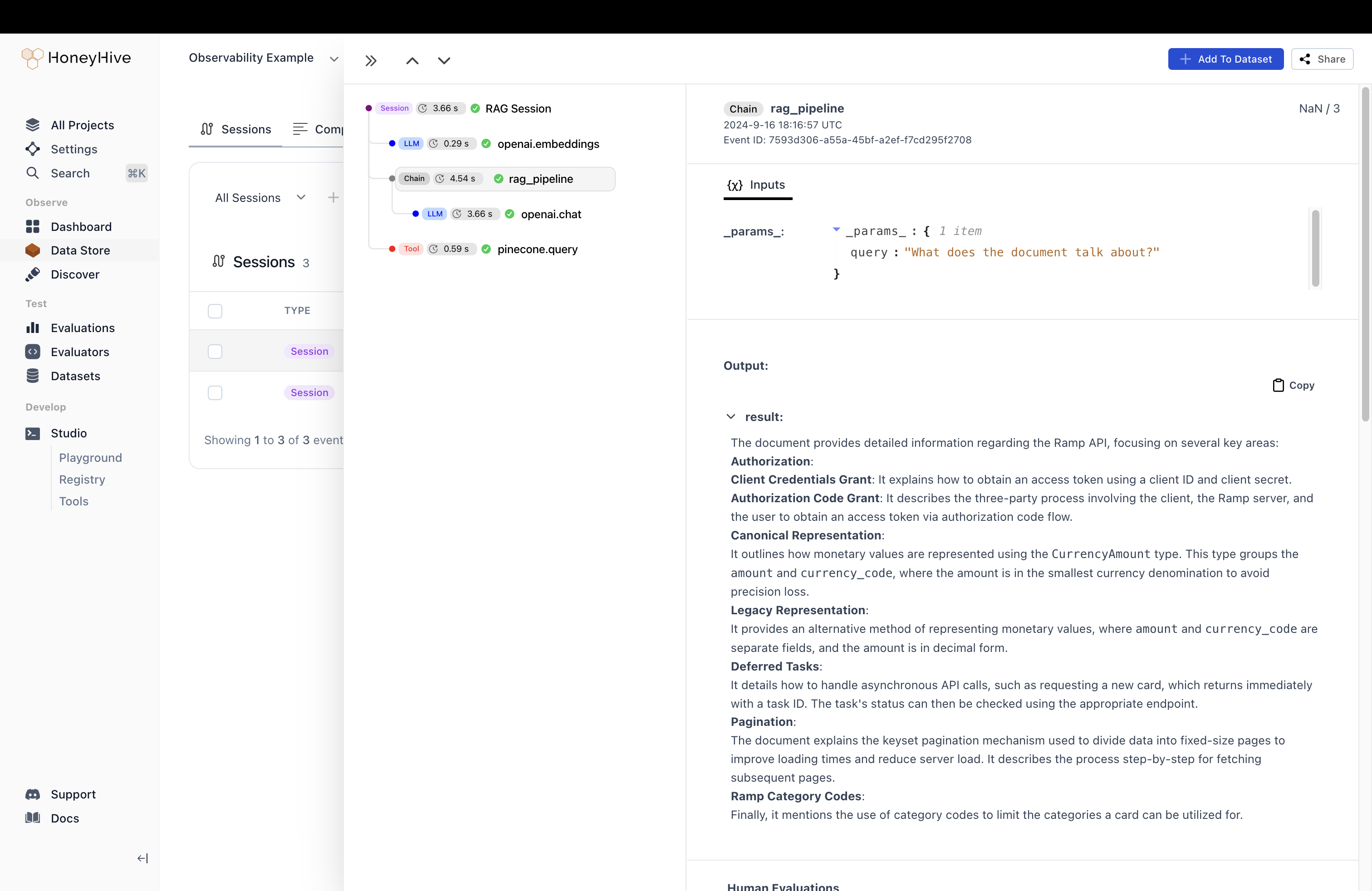 Let’s combine all the concepts we’ve covered into a complete example of a RAG application with HoneyHive observability:- We set up the necessary environment variables and initialize the HoneyHive Tracer.
