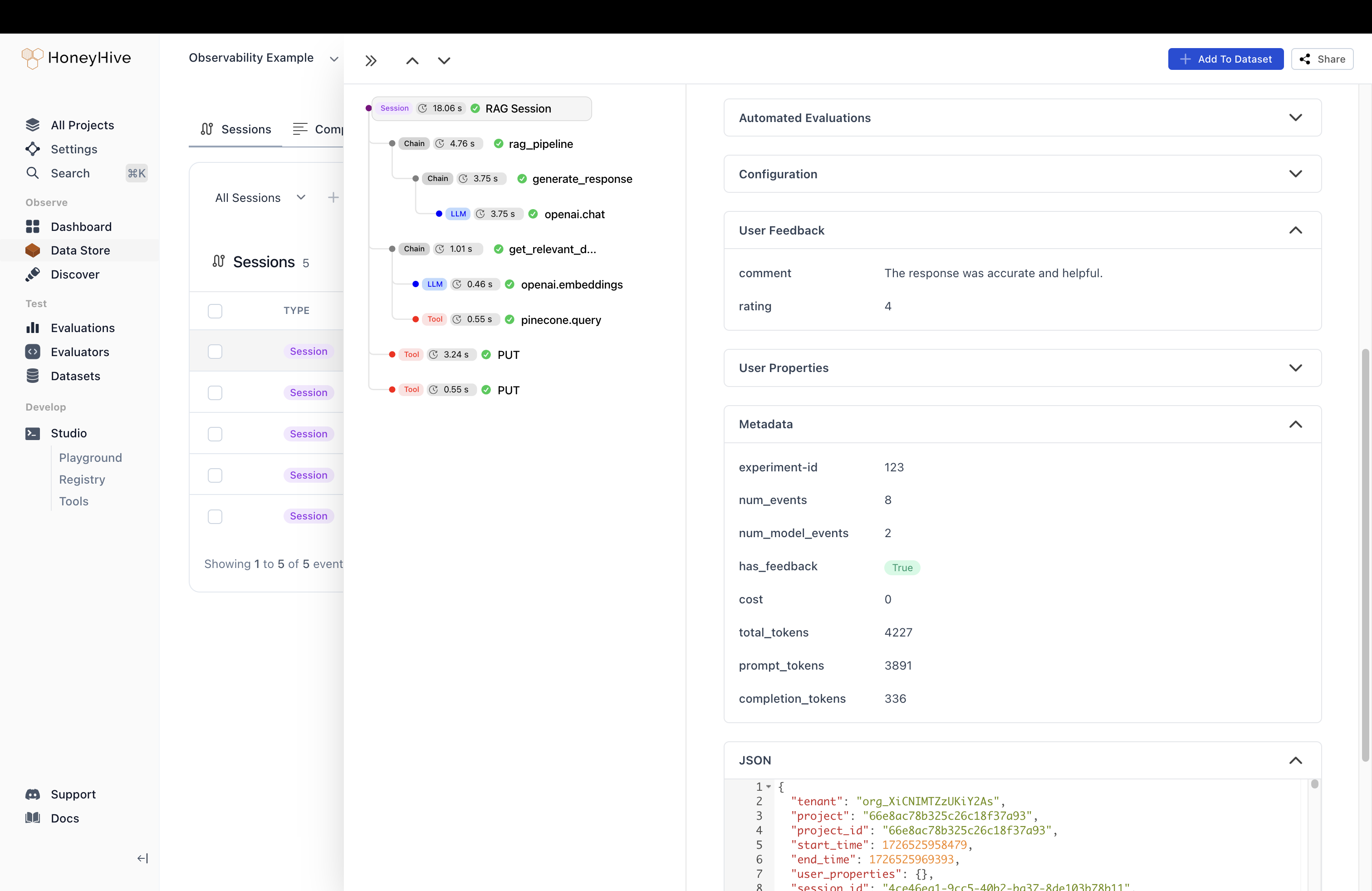 The golden path for adding observability with HoneyHive happens in 2 phases. Phase 1: Capture the data- Auto-capture LLM and vector DB calls